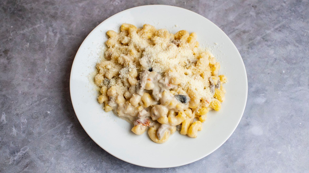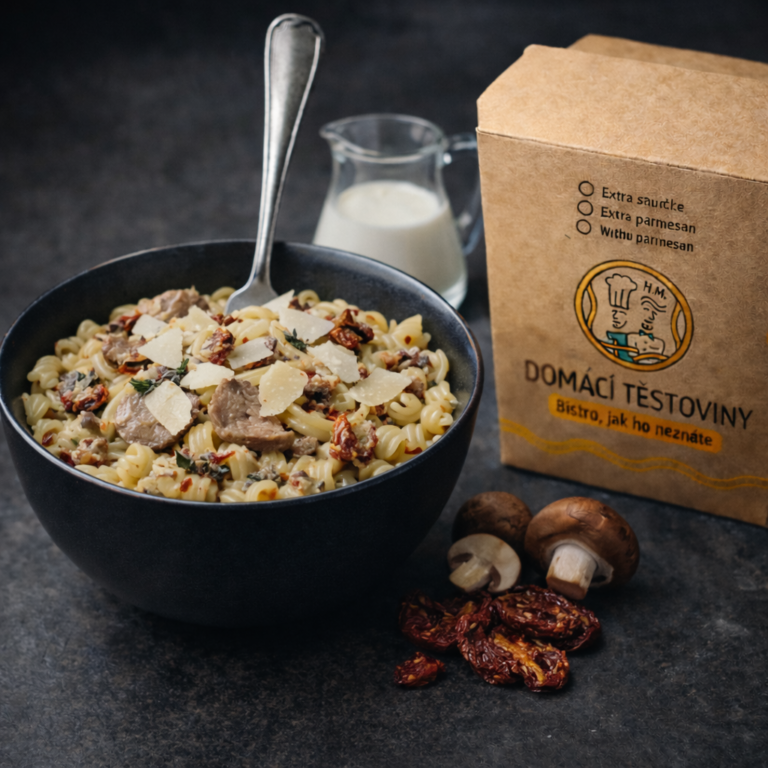 Čerstvé těstoviny s vepřovou panenkou ve smetanové omáčce s krémovými žampiony, sušenými rajčaty a parmazánem