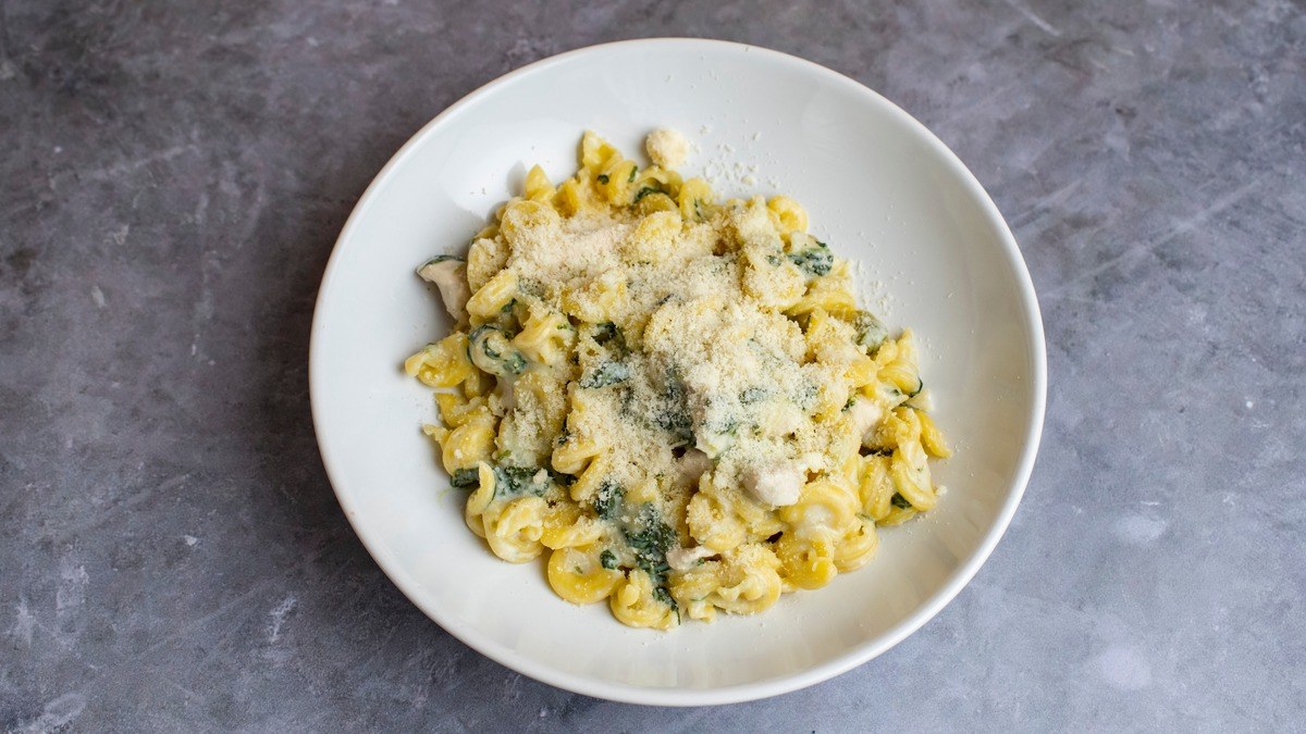 Čerstvé těstoviny s kuřecím masem ve smetanové omáčce se špenátem, špetkou bílého pepře a parmazánem 180.00Kč kuřecí maso, špenát, smetana, cibule, česnek Category: 3 – Hlavní menu